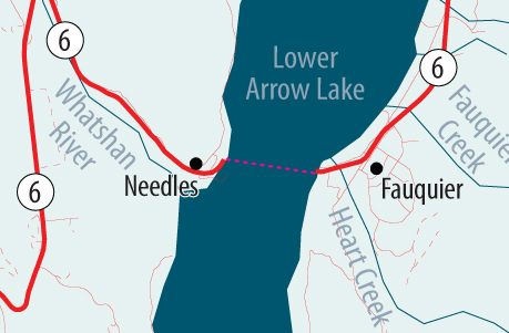 The Needles Cable Ferry crosses Lower Arrow Lake, about 59 km South of Nakusp, BC, on Highway 6 between Fauquier and Needles and provides year-round service, 24 hours a day, 7 days a week.